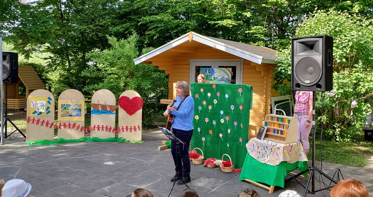 Familiengottesdienst am 8. Mai 2022 im Kindergarten Einen bunten Familiengottesdienst konnten wir am vergangenen Sonntag mit dem Bücherwurm Friedolin und Maren Wejwer von der Landeskirche feiern. Im schattigen Außengelände des Kindergartens Wilferdinger Straße saßen Kinder, Eltern, Grußeltern und Gemeindeglieder um fröhlich zu singen und den Geschichten des Bücherwurms zu lauschen. Der Gottesdienst bildete den Abschluss der Kinderbibelwoche im Kindergarten. Direkt im Anschluss startete das Sommerfest des Kindergartens mit Spielstationen für Große und Kleine. Der Elternbeirat sorgte dafür, dass keiner verhungern musste. Ein herzliches Dankeschön an alle, die dieses Fest ermöglicht haben.