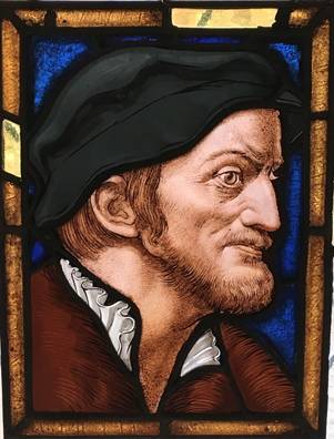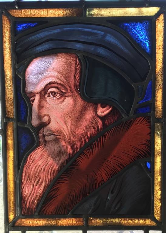Um herauszufinden, warum diese drei Reformatoren in den Fenstern dargestellt sind, versuche ich mich in die Gedanken derer hineinzuversetzen, die diese Fenster in Auftrag gegeben haben. Singen war lutherisch geprägt. Seit 1821 ist die badische Landeskirche uniert. Das meint: unter dem sanften Druck des Großherzogs haben die beiden bis dahin selbstständigen evangelischen Kirchen in Baden, die lutherische und die reformierte Kirche, sich zu einer Kirche zusammengeschlossen. Eine Besonderheit unserer badischen unierten Kirche ist, dass man sich auf ein gemeinsames Bekenntnis der unterschiedlichen Theologien geeinigt hat. Deshalb gibt es seither einen badischen Katechismus, der dies Bekenntnis, das sich aus calvinistischer wie aus lutherischer Tradition speist, erläutert.