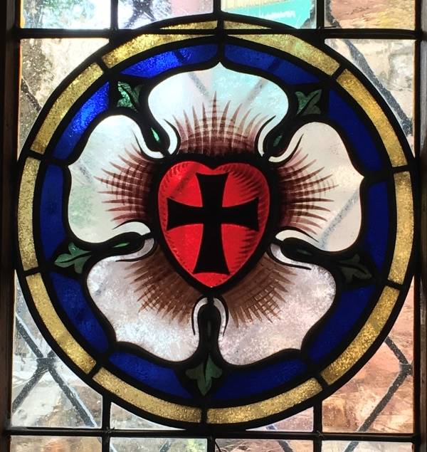 Das dritte Reformationsfenster unserer Kirche zeigt nicht Luther, sondern sein Siegel, die Lutherrose, das Symbol der evangelisch-lutherischen Kirchen.